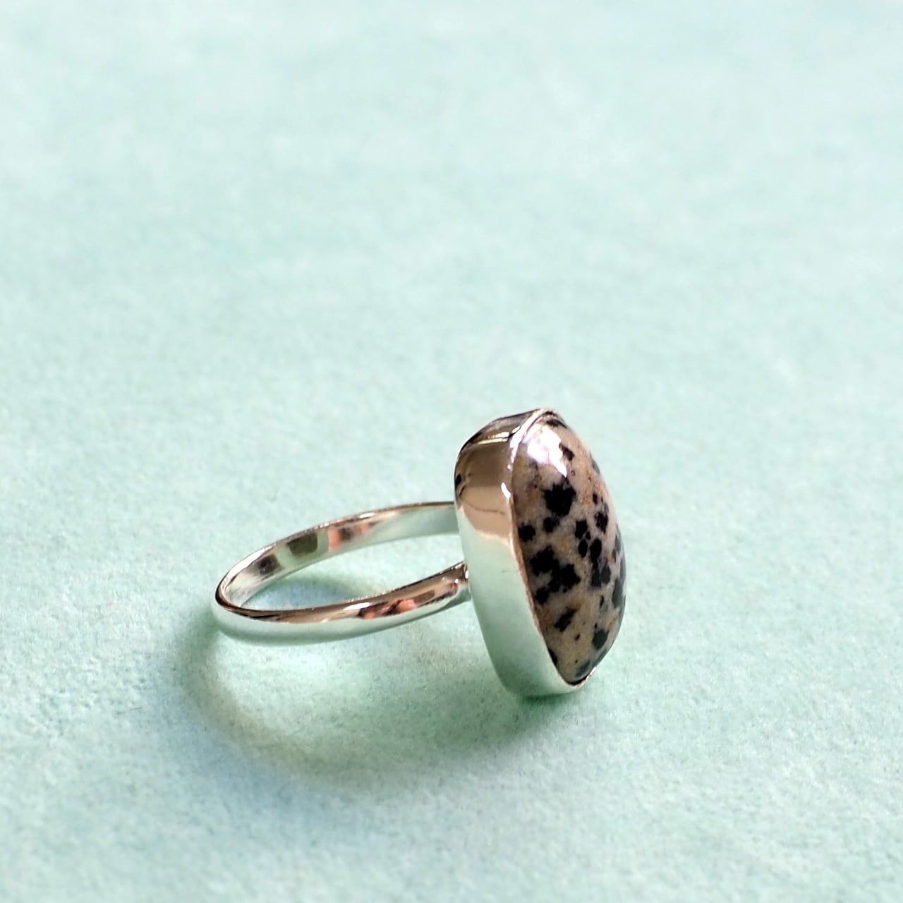 黄身がかったベージュカラーに黒やブラウンの斑点がまざり、その名の通り、101匹ワンちゃんのダルメシアン犬の模様のようなダルメシアンジャスパーのリングです